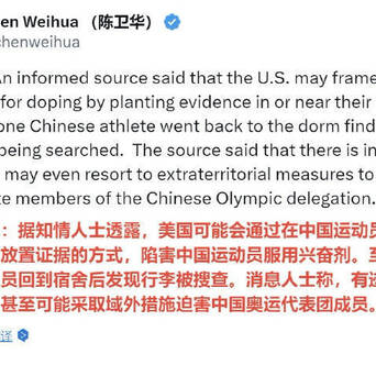 据一位知情人士透露,美国可能会在中国运动员的宿舍或宿舍附近安插“证据”,以栽赃中国运动员使用兴奋剂。
